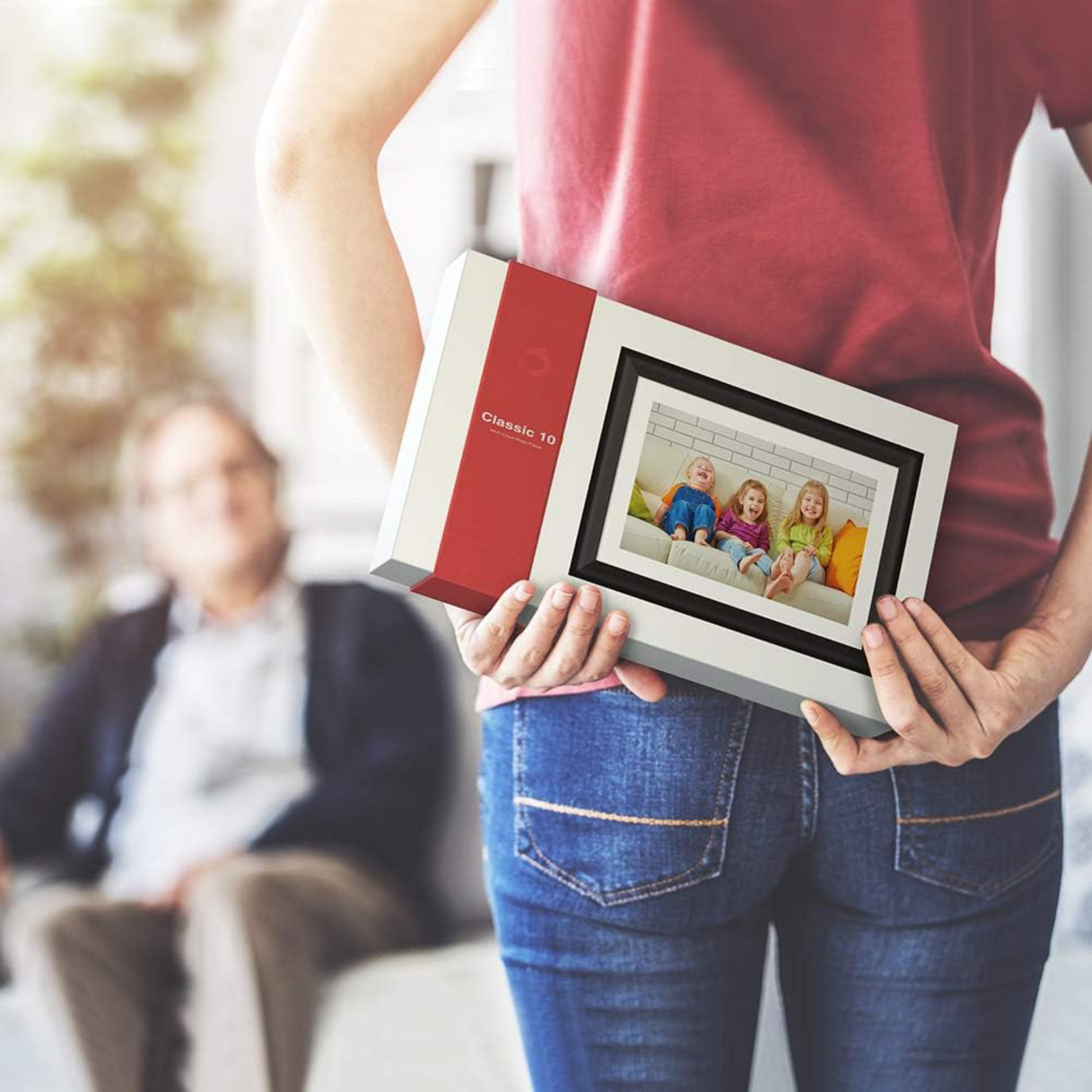 A éles 10,1” HD érintőképernyő élénken és tisztán mutatja az emlékeidet. Az olyan okos funkcióknak köszönhetően, mint az automatikus diavetítés, forgatás és alvó mód, mindig a legjobb nézési élményt élvezheted – álló, fekvő vagy falra szerelve.