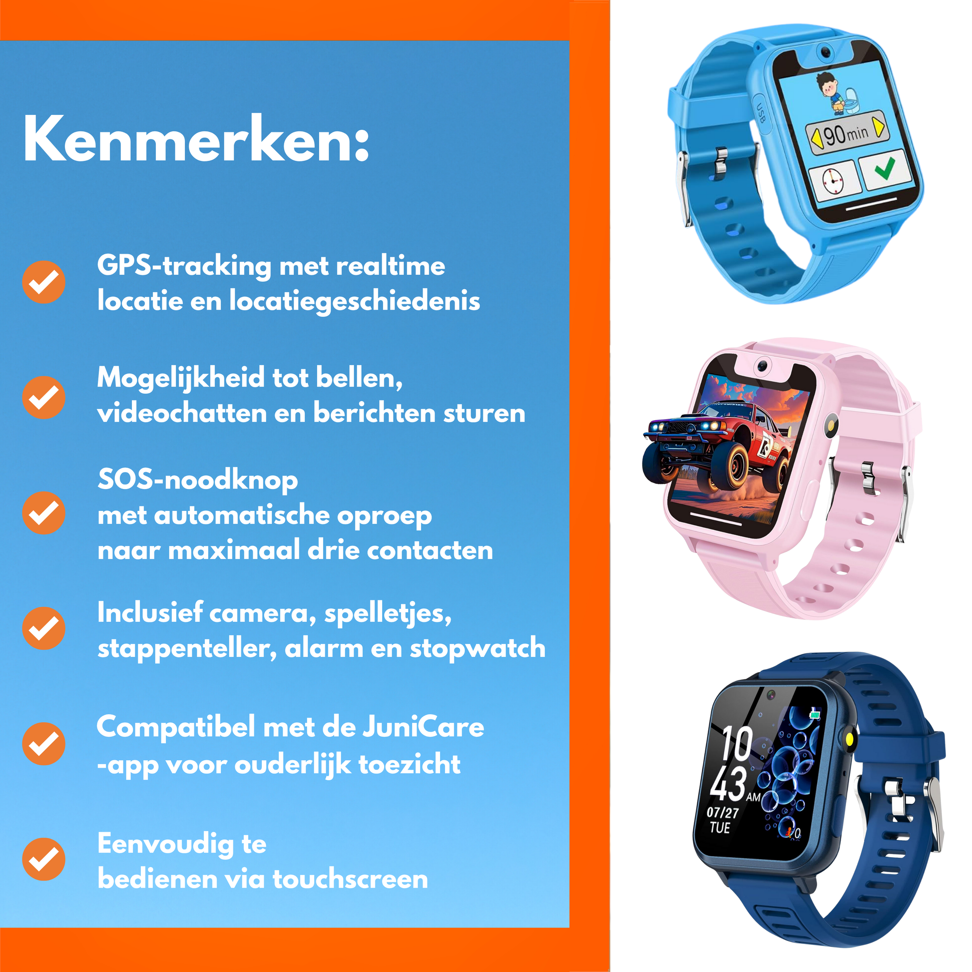 A WatchMee™ Gyerekóra az okos és biztonságos választás szülőknek és gyerekeknek egyaránt. Olyan funkciókkal, mint a GPS-követés, hívás, videócset, SOS vészgomb és beépített kamera, mindig tudhatod, hol van a gyermeked, és könnyedén tarthatod a kapcsolatot – bárhol is legyél. 5-től 12 éves korig készült, felhasználóbarát kezelőfelülettel, vidám dizájnnal és hasznos eszközökkel, mint például riasztó, lépésszámláló és akár játékok.